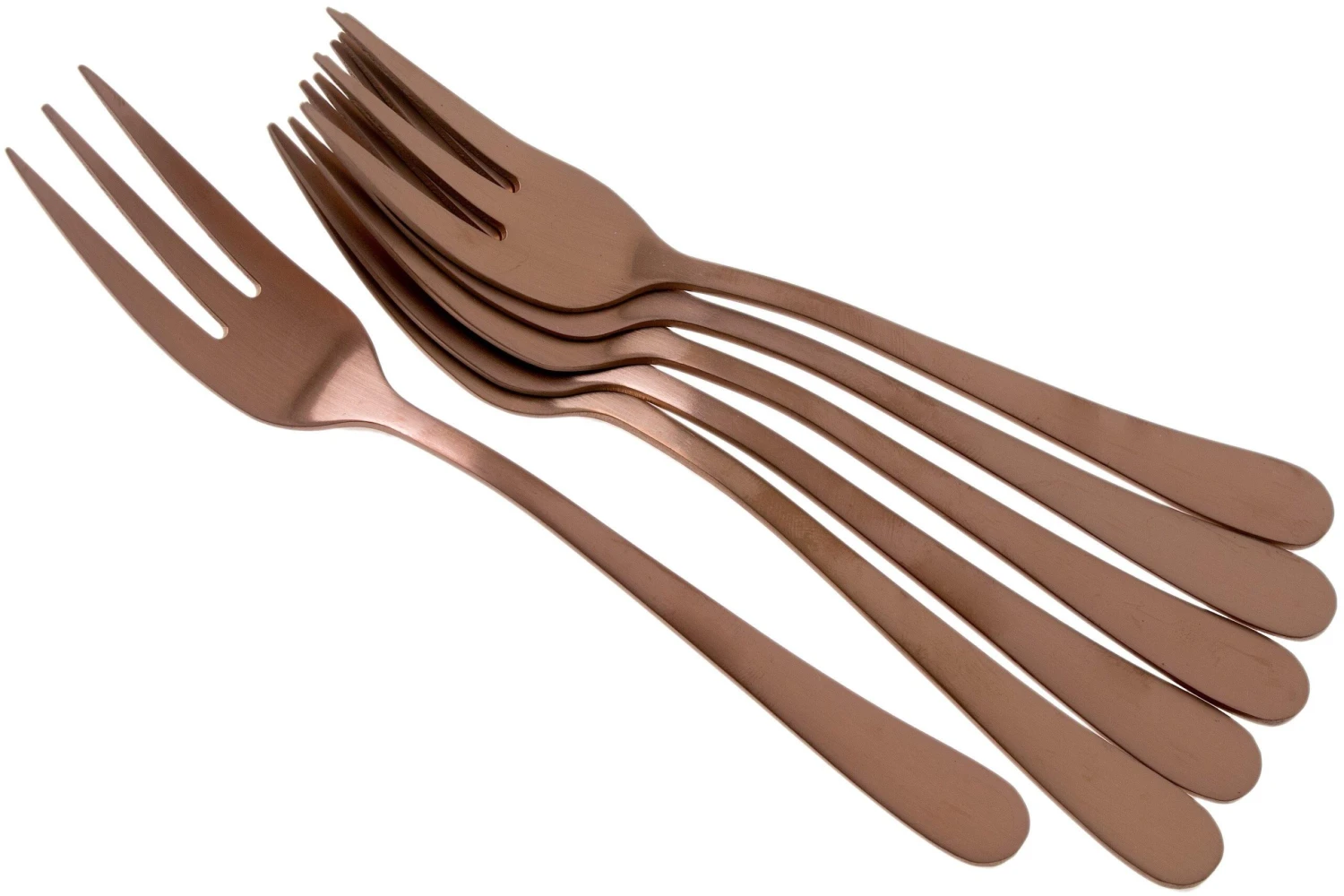 El color cobrizo de estos tenedores de reposterÃa Amefa Austin 1410 les da un aspecto muy moderno. Están fabricados en acero inoxidable 18/0 y mejorados con un fino revestimiento de PVD de titanio. La longitud de estos tenedores de pastelerÃa es de 14 cm.