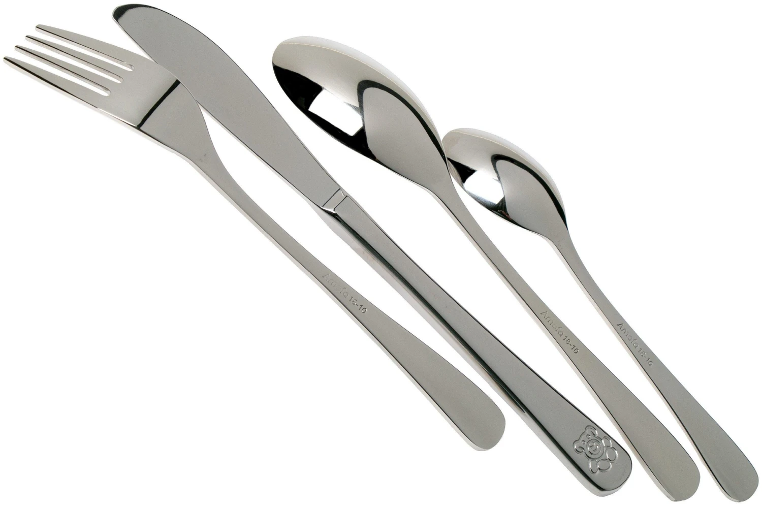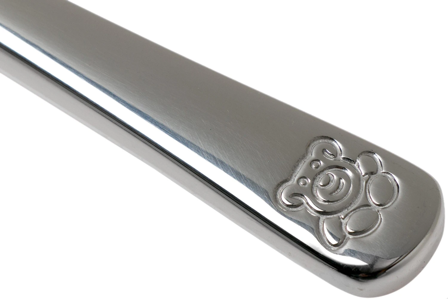 Este juego de cubiertos para niños está cuidadosamente confeccionado. Las partes afiladas del cuchillo y del tenedor están redondeadas para que su uso sea siempre seguro. Perfecto para niños de 4 a 6 años. Todas las piezas están realzadas con la imagen de un oso feliz. El juego se guarda en una alegre y colorida caja de regalo.