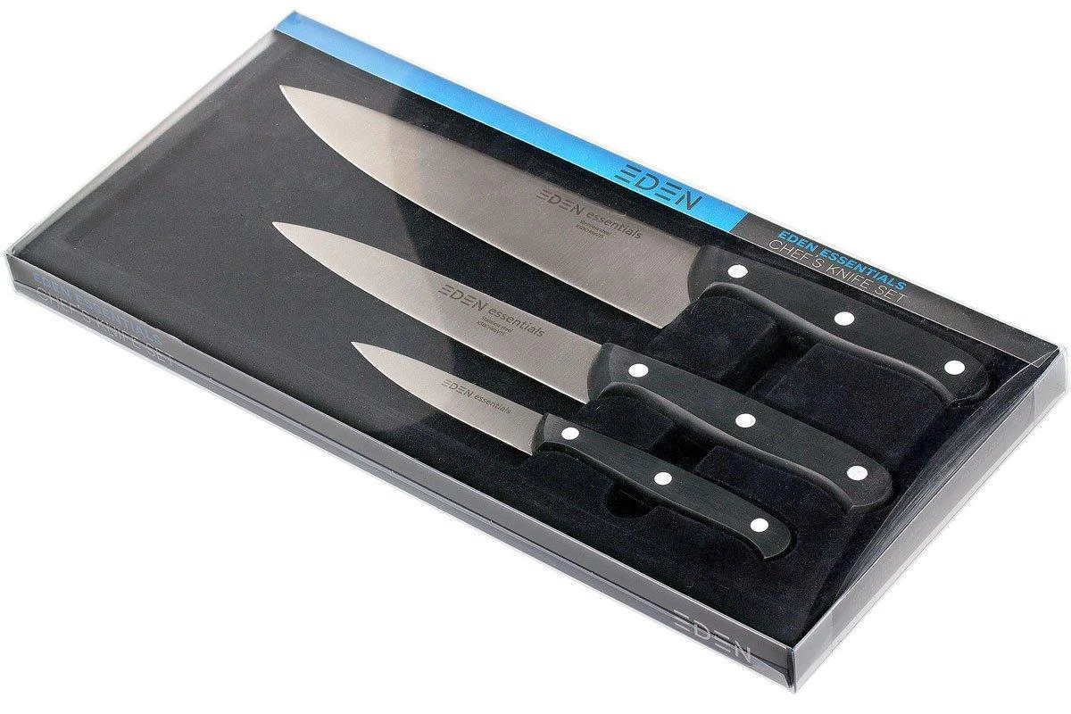 El cuchillo de chef, el cuchillo universal y el cuchillo pelador de Eden Essentials son el trÃo perfecto para prácticamente cualquier reto de pelado o corte. El cuchillo de chef puede acabar con casi todo. El cuchillo universal se puede utilizar cuando el cuchillo de chef resulta demasiado grande. Y el cuchillo pelador para cuando se trata de trabajos precisos. Con este juego de cuchillos tendrás todo lo que necesitas para cada tarea de corte y pelado.