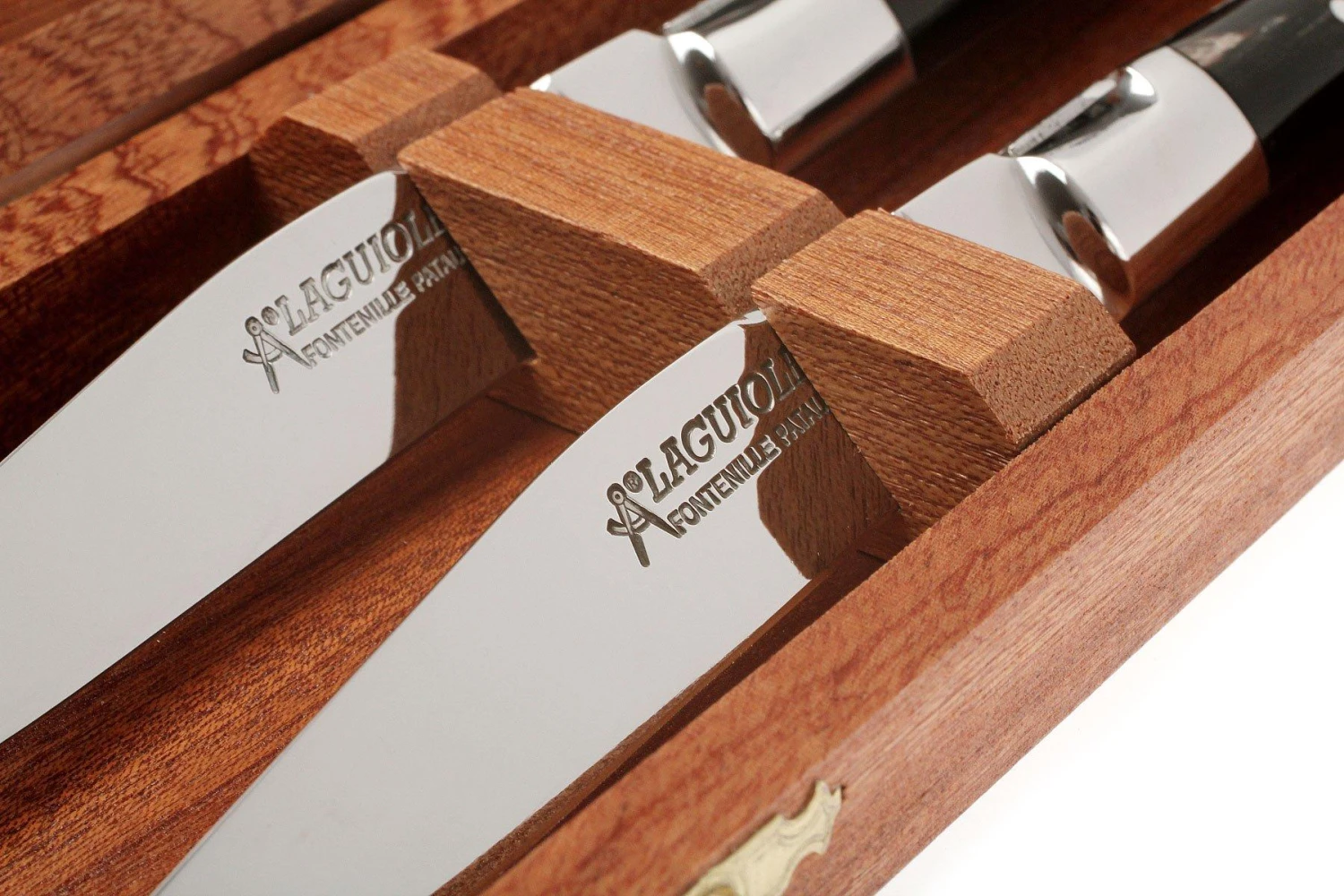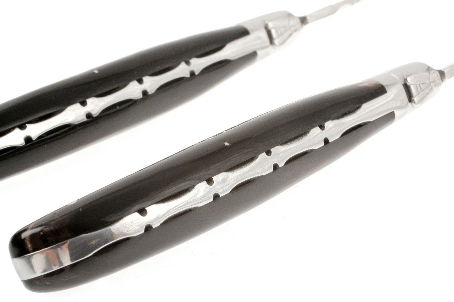 Este juego de cuchillos para carne Fontenille Pataud se compone de dos cuchillos de mesa Laguiole con mango de cuerno de búfalo. Este material es raro y muy valioso. Además, Fontenille Pataud utiliza únicamente las puntas de los cuernos, ya que están más «llenas» y, por tanto, son más preciosas que el resto del cuerno.