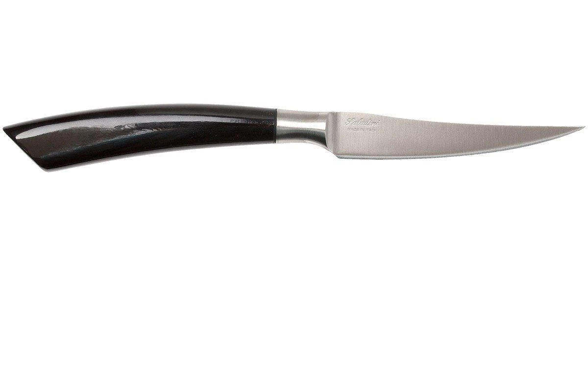 Con un juego de cuchillos para carne de Saladini introducirás en tu hogar herramientas de primera calidad. Este set contiene seis cuchillos para carne en una elegante caja de madera. Los cuchillos miden 23 cm de largo, con un mango de 10 cm y 13 cm de largo. Los mangos de este juego están hechos de cuerno de búfalo, lo que da un aspecto muy lujoso.