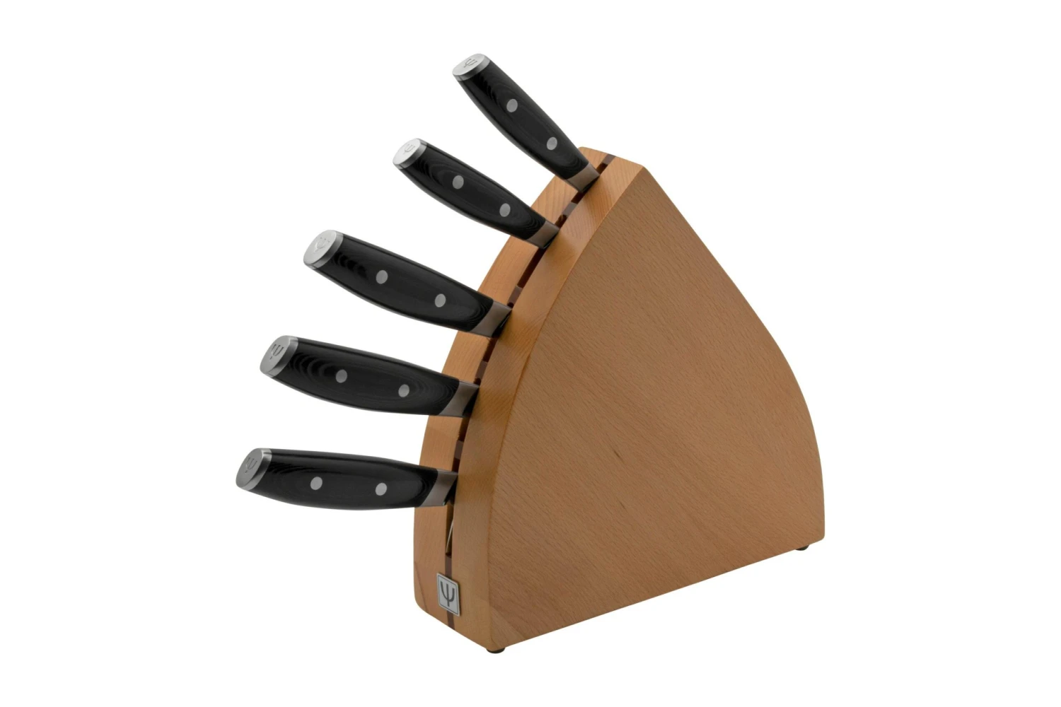 El Juego de cuchillos de 5 piezas Tsuchimon de Yaxell es un elegante y completo juego compuesto por diferentes cuchillos de cocina. Desde un gran cuchillo de chef para todas las grandes tareas de corte cotidianas, como picar un pimiento o una pechuga de pollo, hasta un pequeño cuchillo para pelar frutas y verduras.